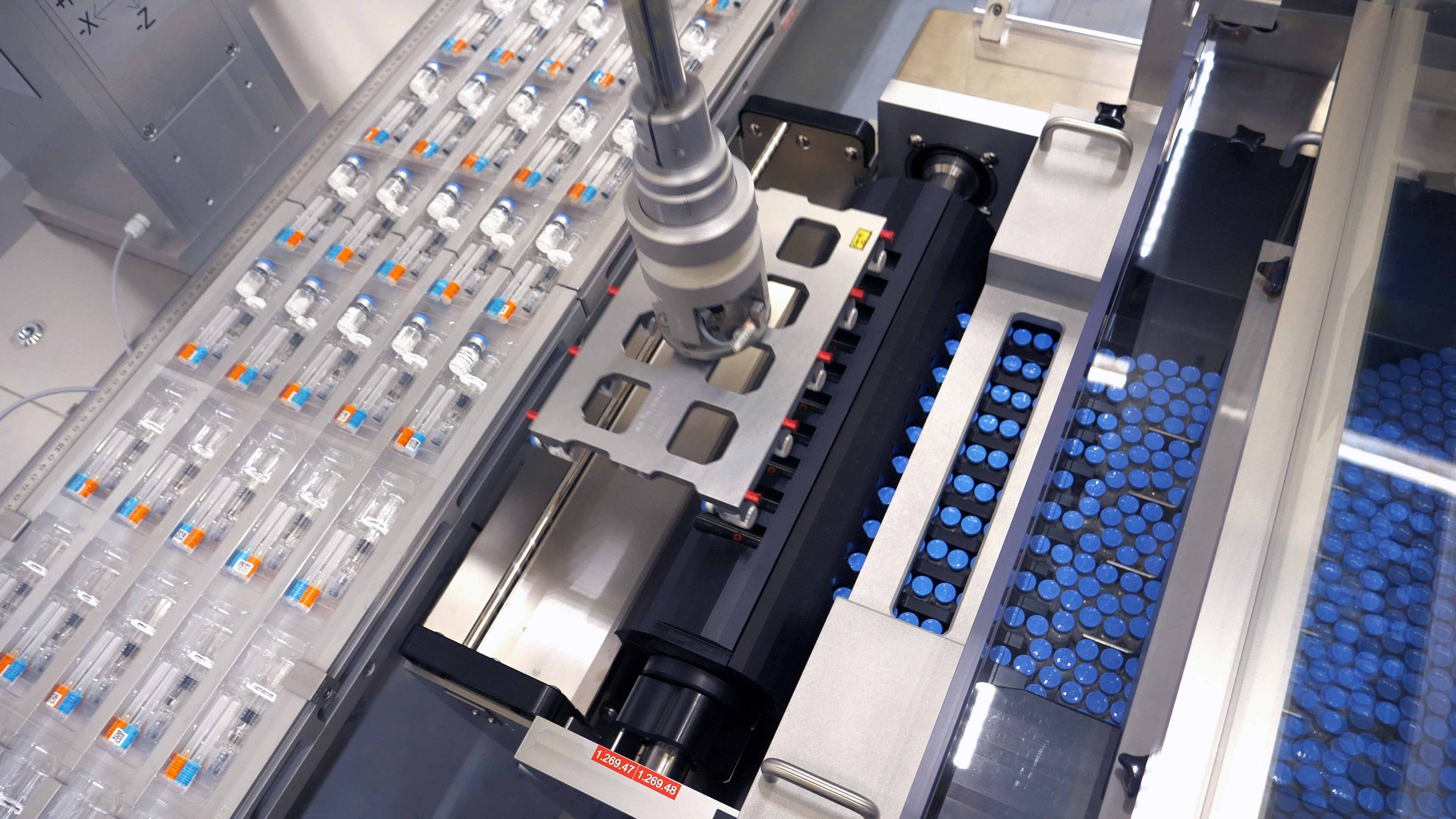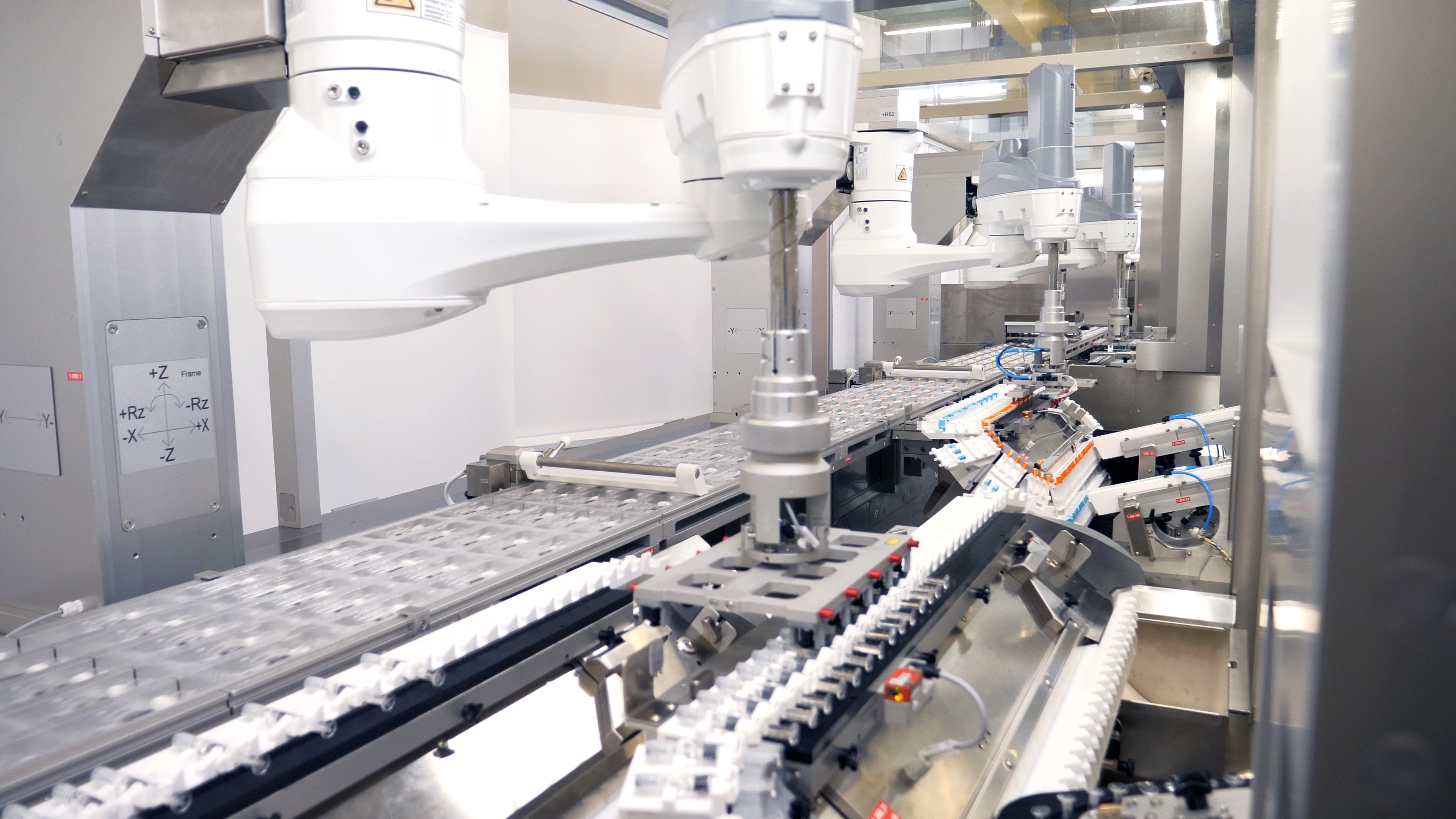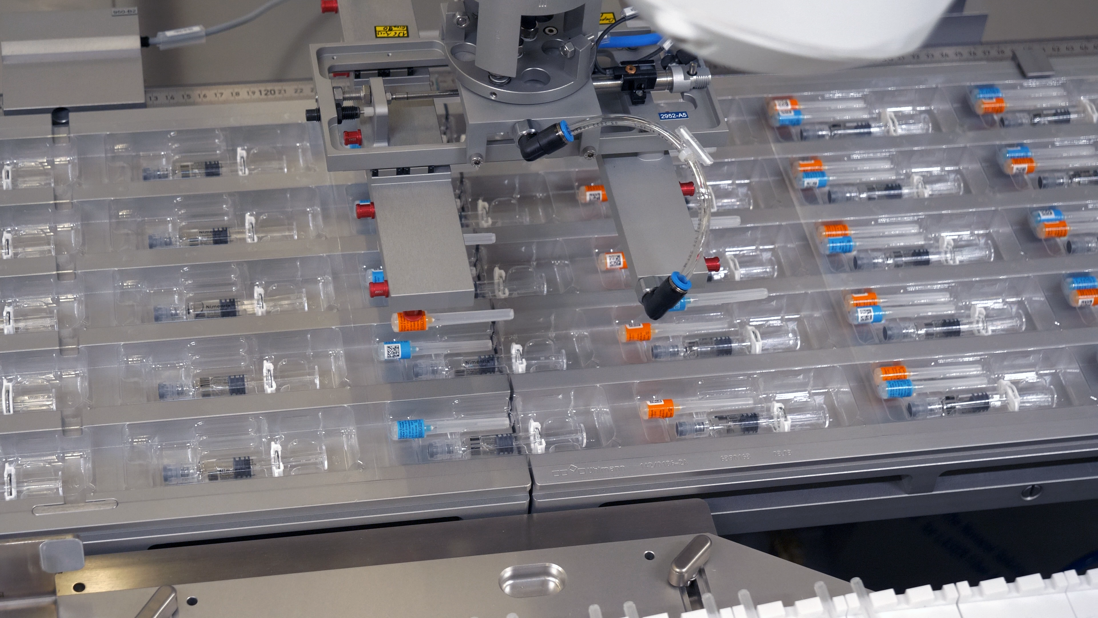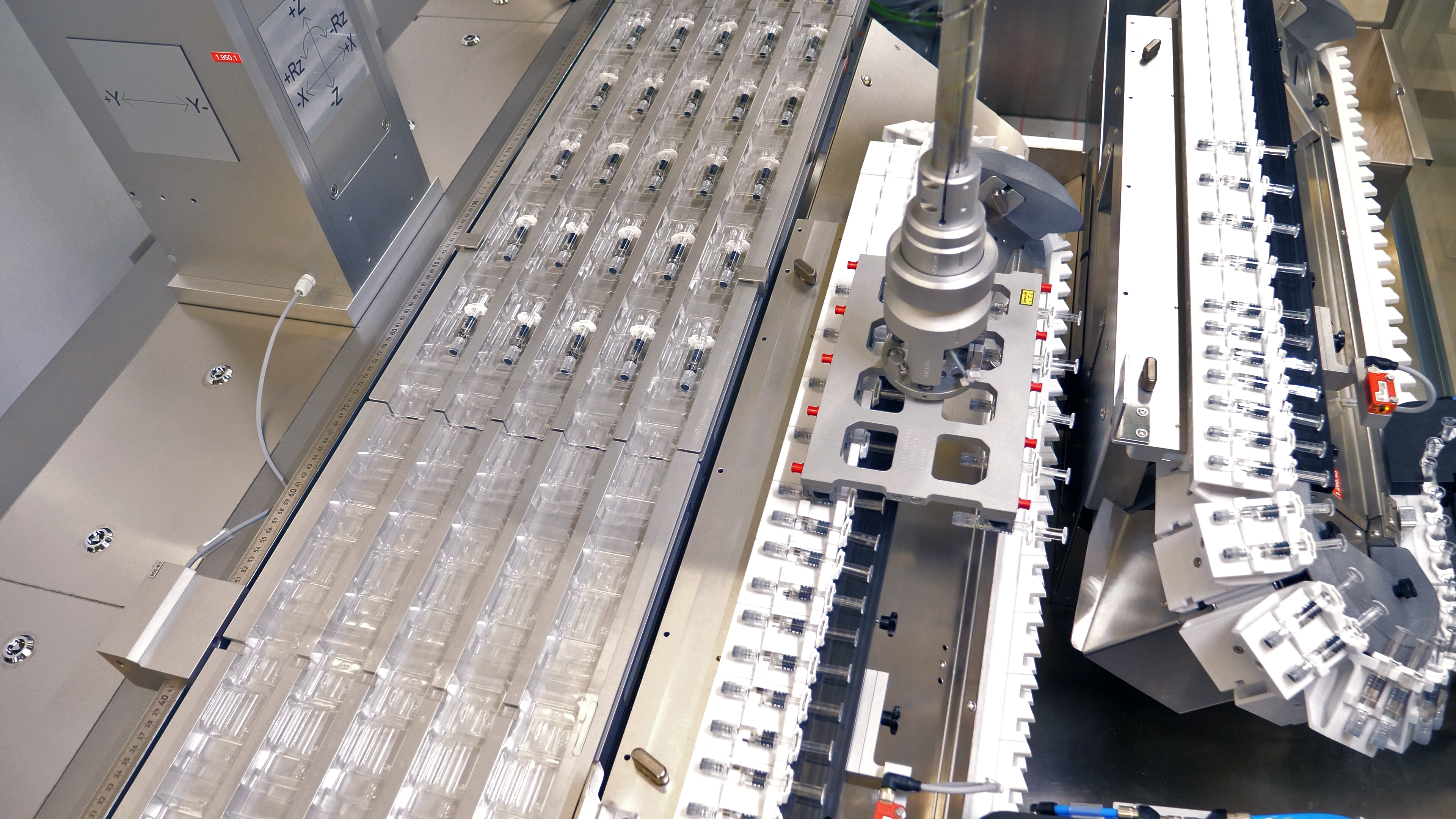 An der ersten Roboterstation steht das Einlegen befüllter Spritzen in die Blister auf dem Programm. Bereits hier bestehen hohe Anforderungen an die Dynamik des Stäubli SCARA TS2-60. Beeindruckende 200 Spritzen pro Minute legt der hochdynamische Roboter zuverlässig ein. Sie werden dem Vierachser über eine von Uhlmann speziell für empfindliche Glasspritzen entwickelte SyPro-Zuführung präsentiert. Dabei erfolgt der Transport zunächst hängend und erst kurz vor der Entnahme wird um 90 Grad so gedreht, dass der Vakuumgreifer des Roboters jeweils zehn Spritzen aufnehmen und ablegen kann.