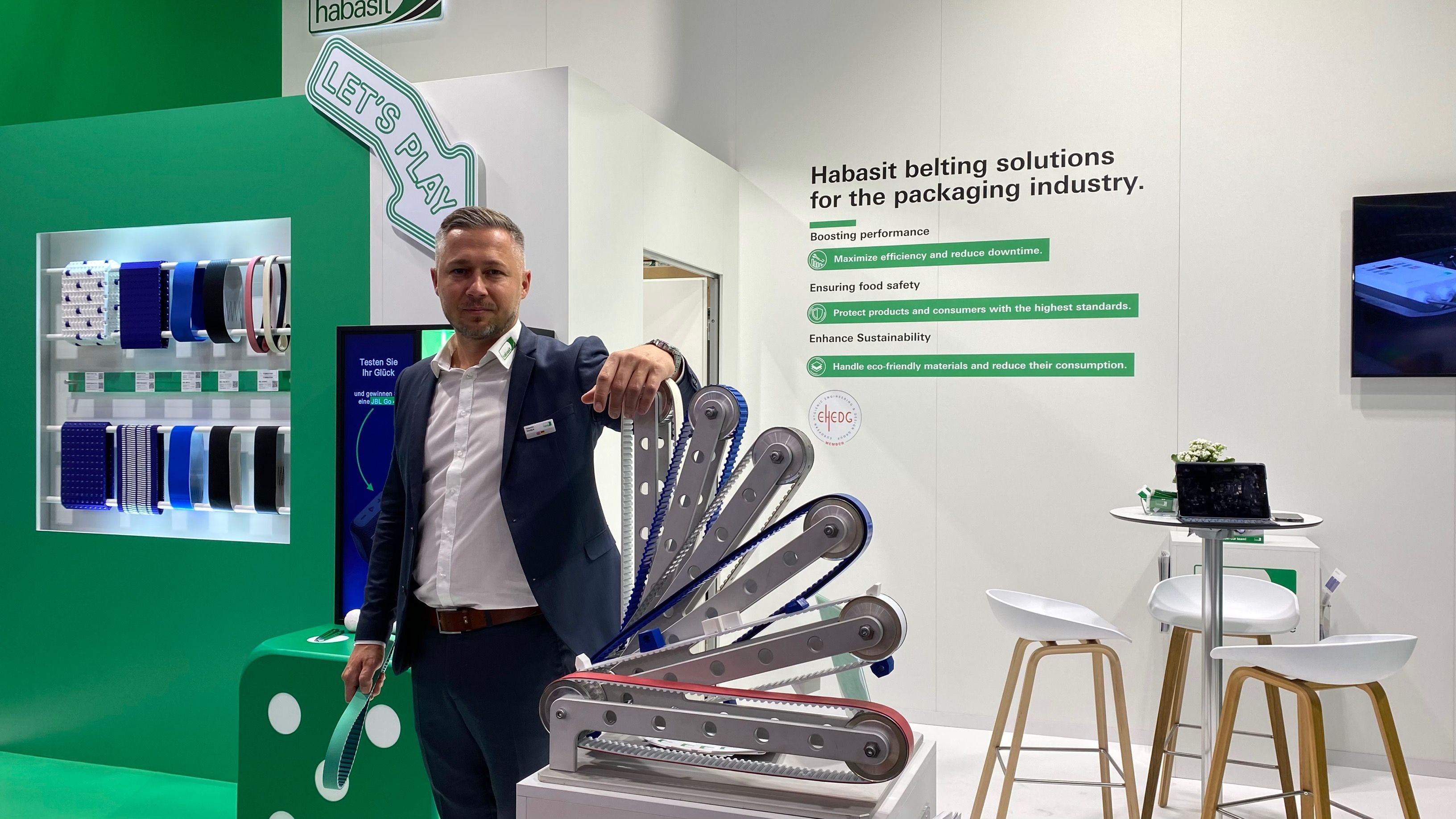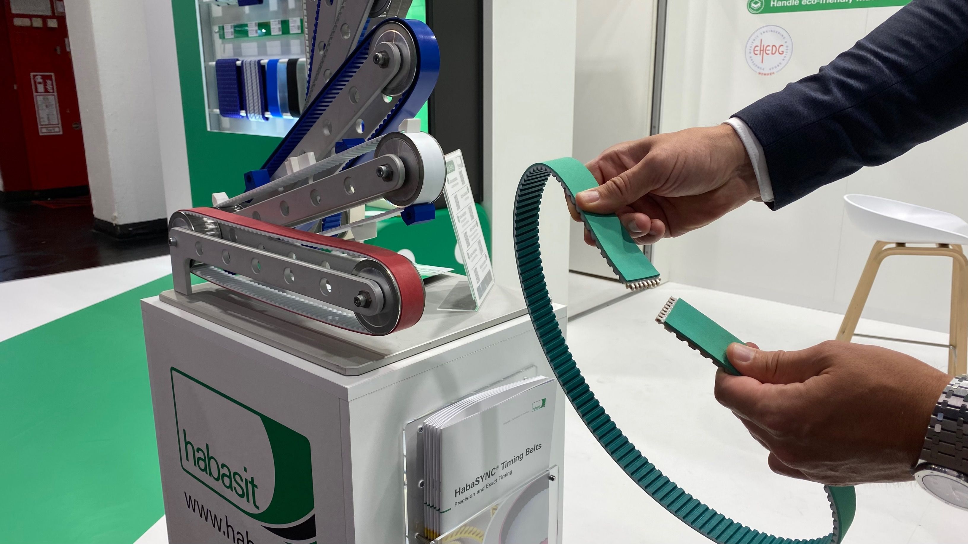 Highlight des Standes von habasit: Der Austausch der neuen wechselbaren Zahnradbänder, die die Wartungszeiten von 8 Stunden auf eine halbe verkürzen. Genau für diese Kommunikation ist die Messe da.