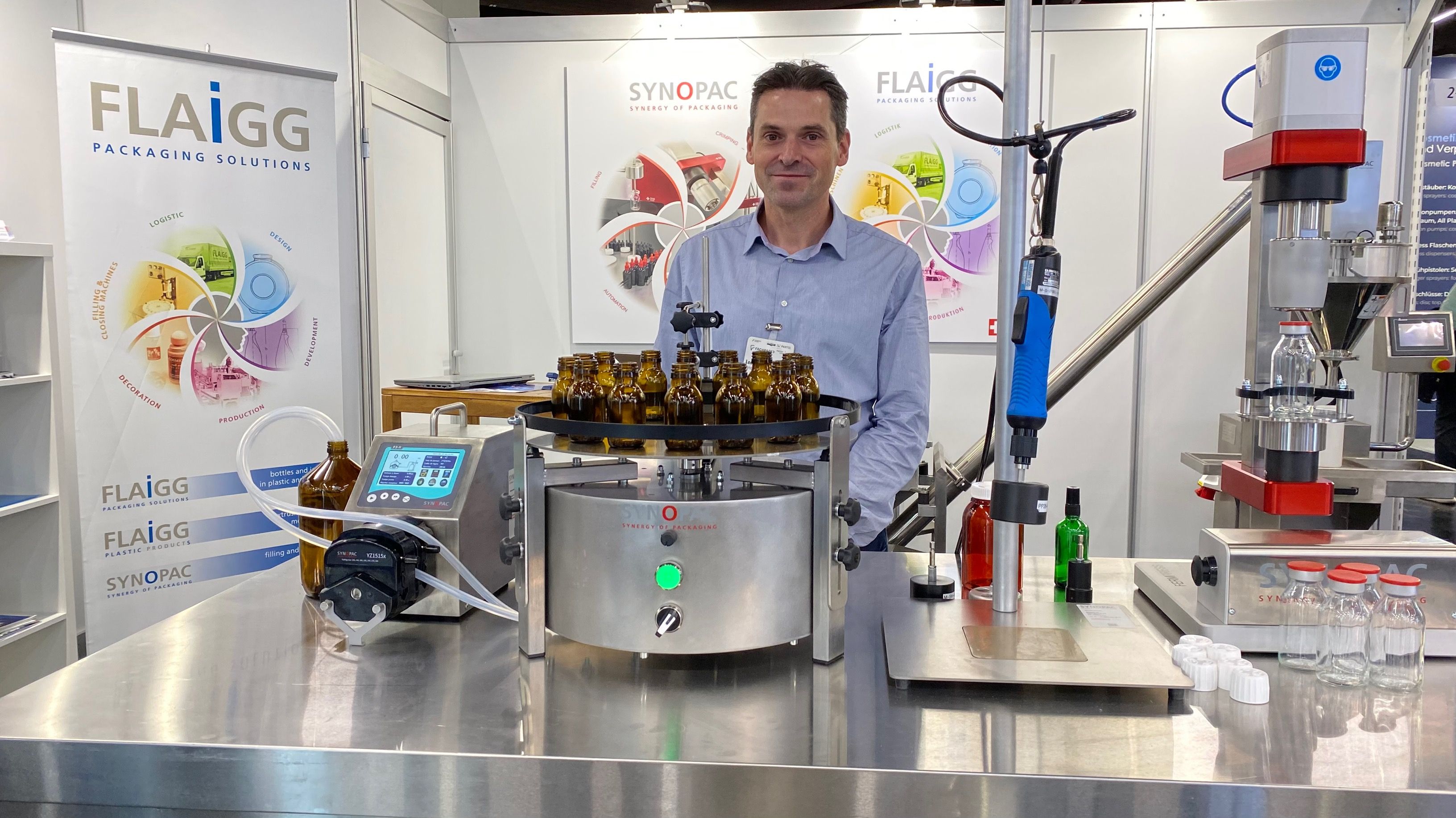 Bei Synopac war der erste Tag gut angelaufen und bis zum Vormittag des zweiten Tages eher verhalten. Mit ihren modularen Abfüll- und Etikettierlösungen zielt der Anbieter auf Kunden mit kleinen Produktionsmengen ab, wie etwa Apotheken.